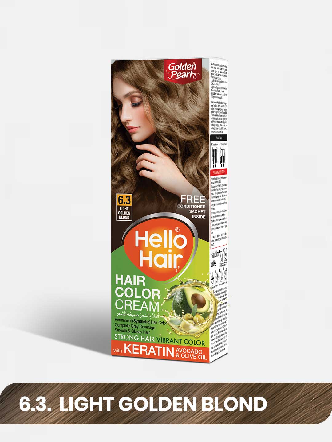 Mixing: Transfer Golden Pearl Hello Hair - Hair Color Cream and Developer in equal proportion in a plastic or glass container. Mix well with the help of a hair coloring brush, to form a homogeneous paste. Apply immediately. Application: To prevent staining hands and clothes, use gloves and cover your shoulder area with a towel or gown. Apply the mixture to the washed and completely dried hair with the help of a brush on areas you want to color, evenly to the length and tips of your hair. Spread the leftover mixture on the rest of the hair. Apply to the roots strand by strand and leave it for 30 minutes. Dispose of the leftover mixture, carefully. After 30 minutes, wet hair a little and gently lather for 1 minute. Wash your hair thoroughly with lukewarm water until the water runs clear. Apply Hello Hair - Hair Color post-color conditioner on your hair and massage gently for 2 minutes. Rinse thoroughly with lukewarm water.